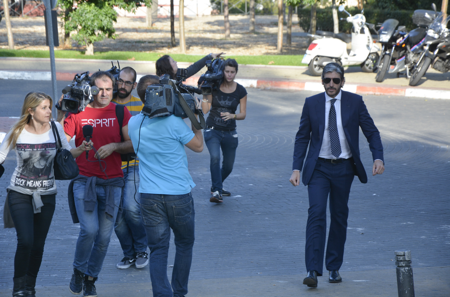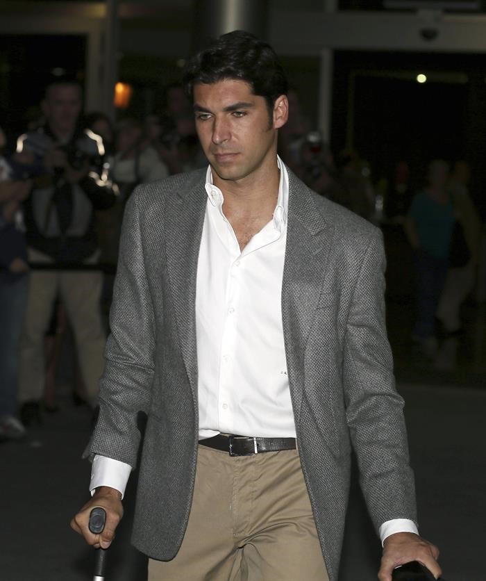 Alfonso de Borbón a su llegada al tanatorio y rodeado de prensa.