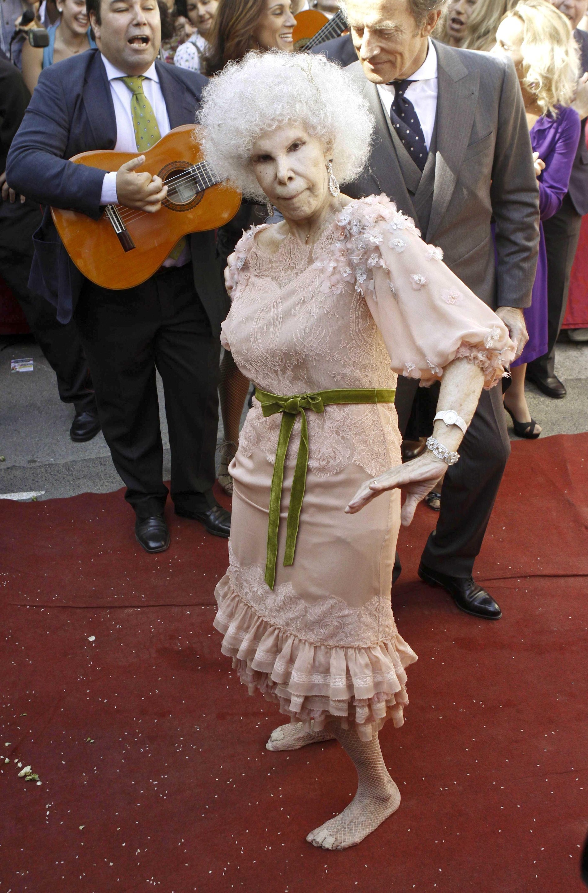 Uno de los momentos inolvisables protagonizados por la duquesa de Alba fue cuando después de su boda con Alfonso Diez, en medio de la alfombra roja, se descalzó y se puso a bailar sevillanas para todos los reporteros.