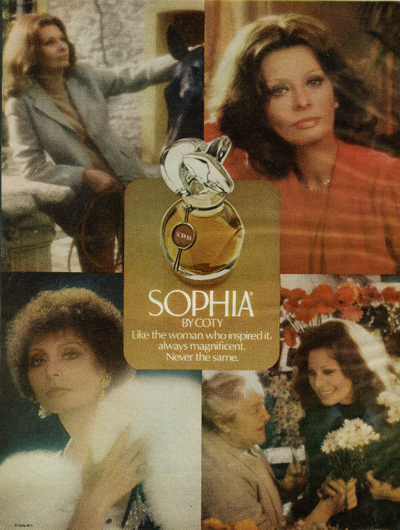 La marca francesa Coty utilizó la imagen de una madura y estupenda Sofía Loren para el perfume que lleva su nombre.