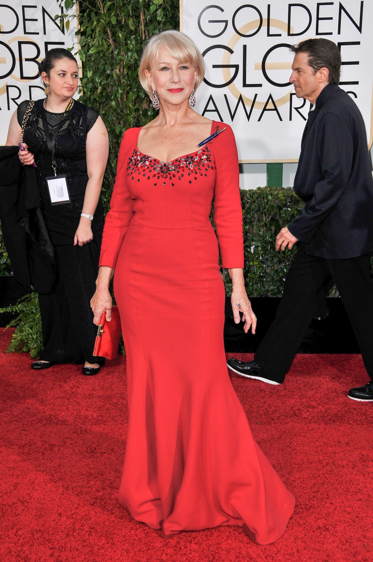 Helen Mirren, que acertó con este diseño rojo con pedrería de Dolce & Gabbana, tuvo un detalle especial anudando en su vestido una pluma en homenaje a los asesinados en Francia.