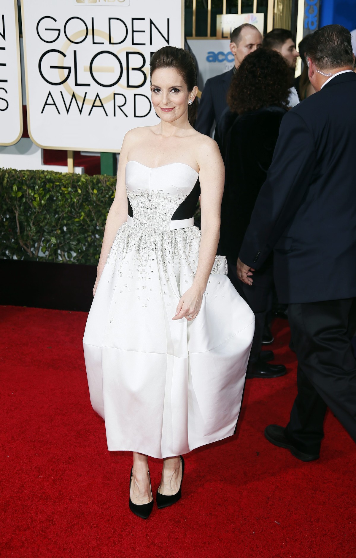 Tina Fey fue una de las peor vestidas de la gala. La actriz que ejerció como presentadora optó por un cargado vestido blanco y negro que no favorecía a su figura.