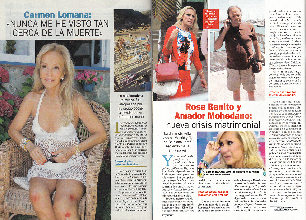 Carmen Lomana, noticia esta semana por su participación en Supervivientes, aparecía entonces en la prensa por un accidente de coche en la playa. Rosa Benito vivía los últimos intentos de salvar su matrimonio con Amador Mohedano. Ella fue la ganadora de la anterior edición de Supervivientes y Amador es actualmente colaborador de Mujeres y Hombres y Viceversa.