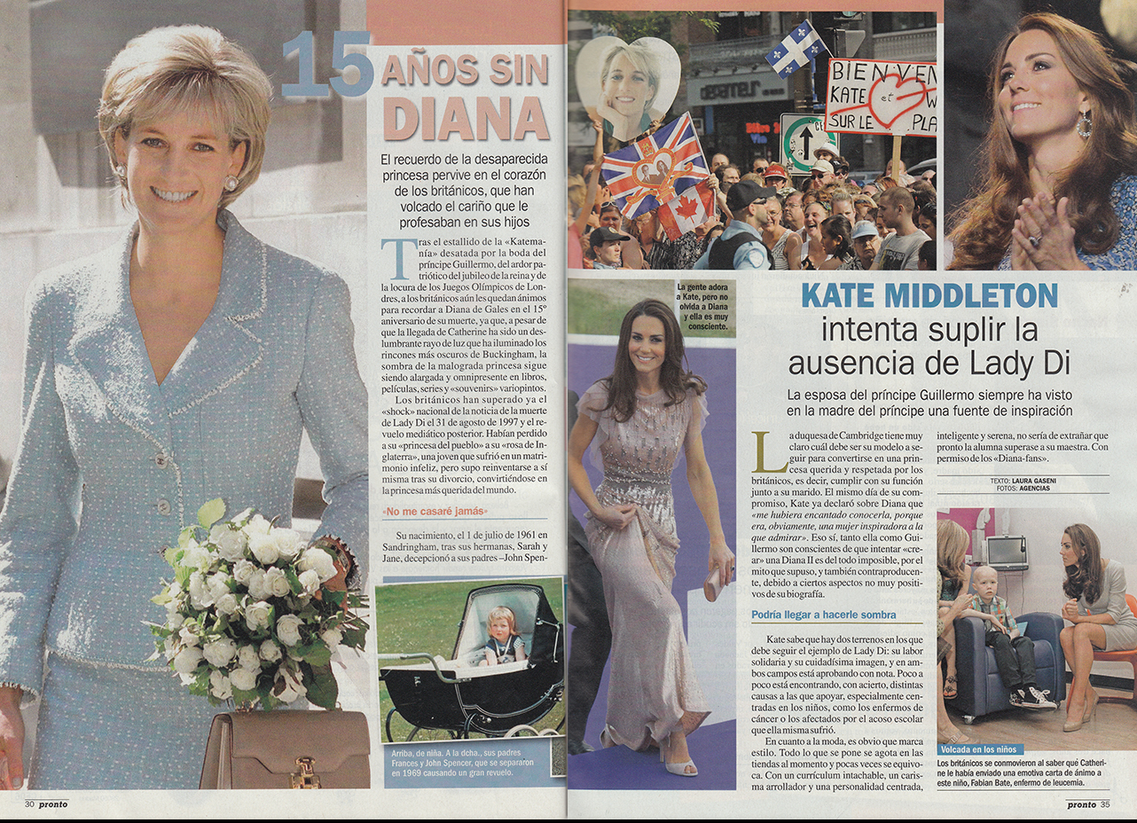 Se cumplían 15 años de la muerte de la princesa Diana. Y Kate Middleton intentaba que la sombra de su desaparecida suegra no se convirtiera en un lastre. Hoy los ingleses la aceptan, tras haber dado a luz a un heredero al el trono y estar ahora mismo a punto de tener su segundo hijo.