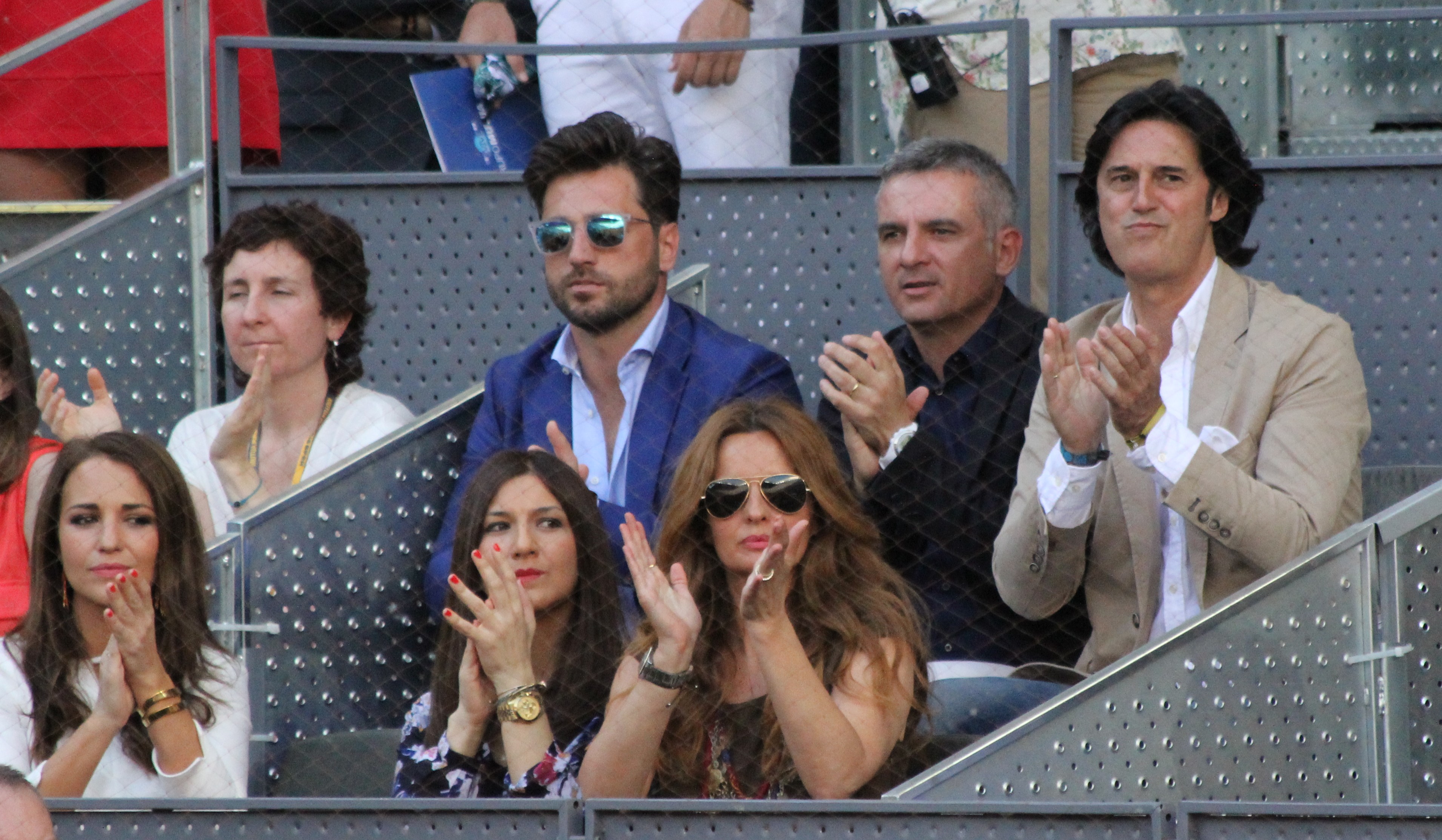 Bustamante contempla atento el torneo. En la fila de abajo, su esposa Paula Echevarría. A la derecha, el bailarín y director artístico de Mira quien baila, Poty.