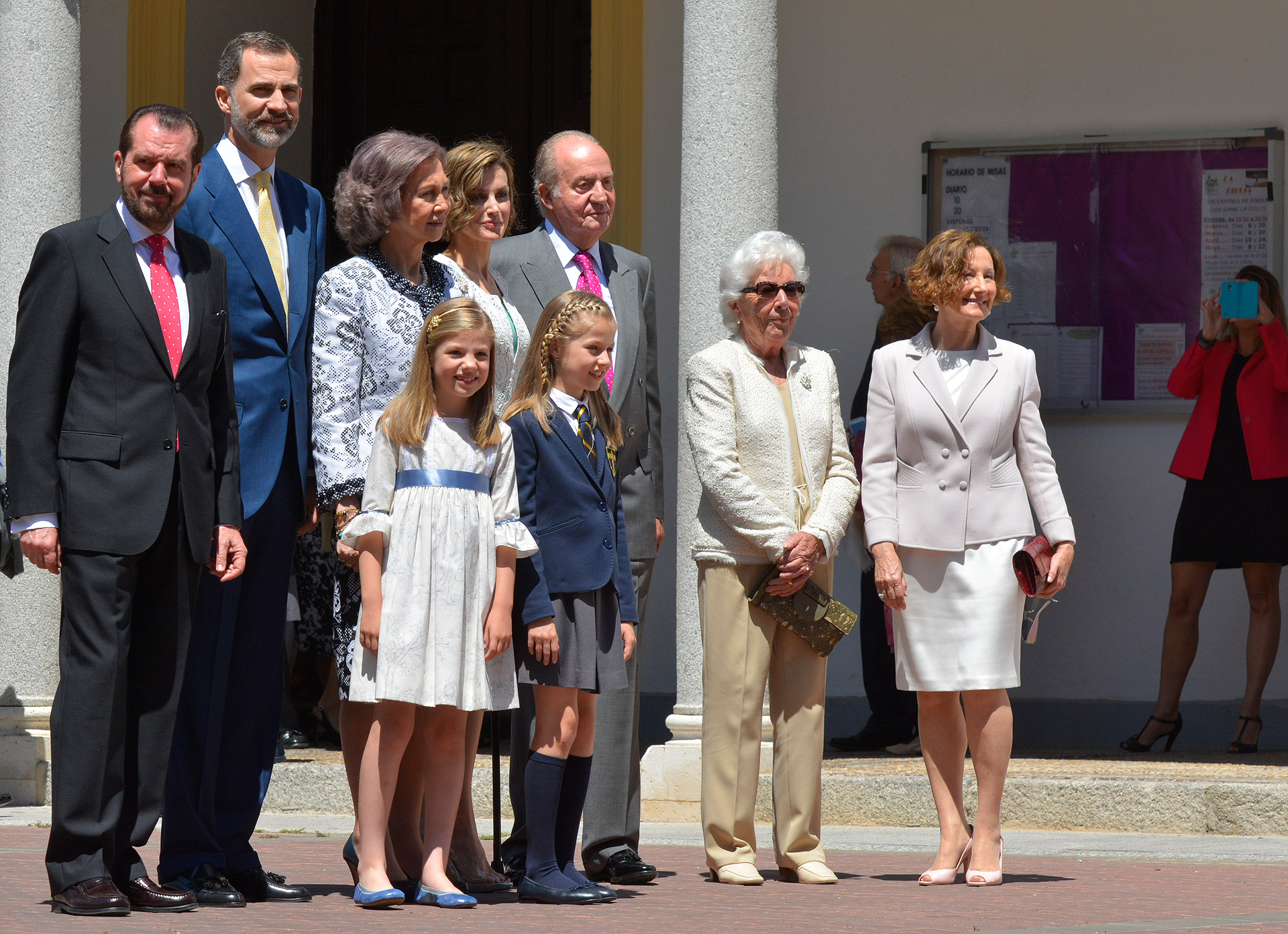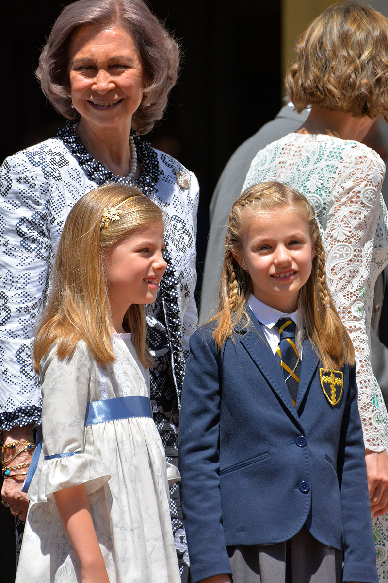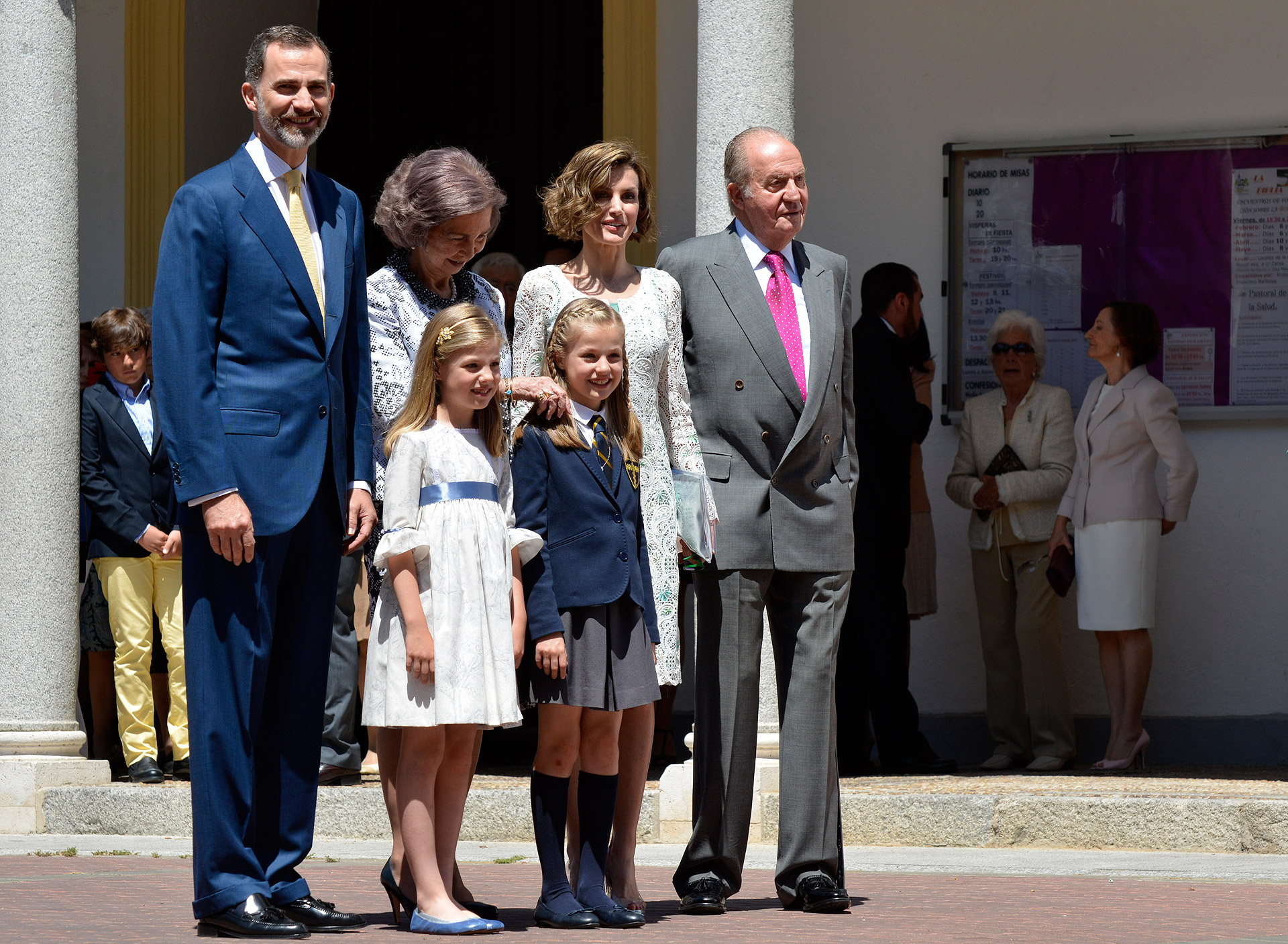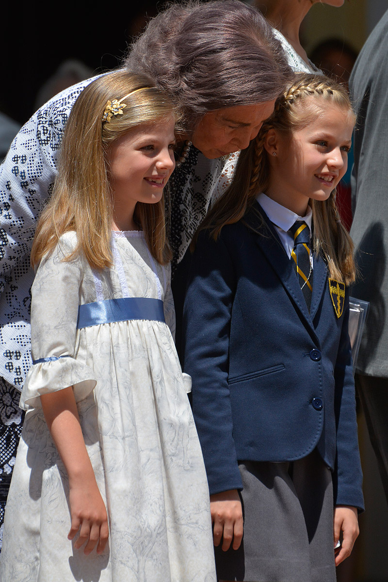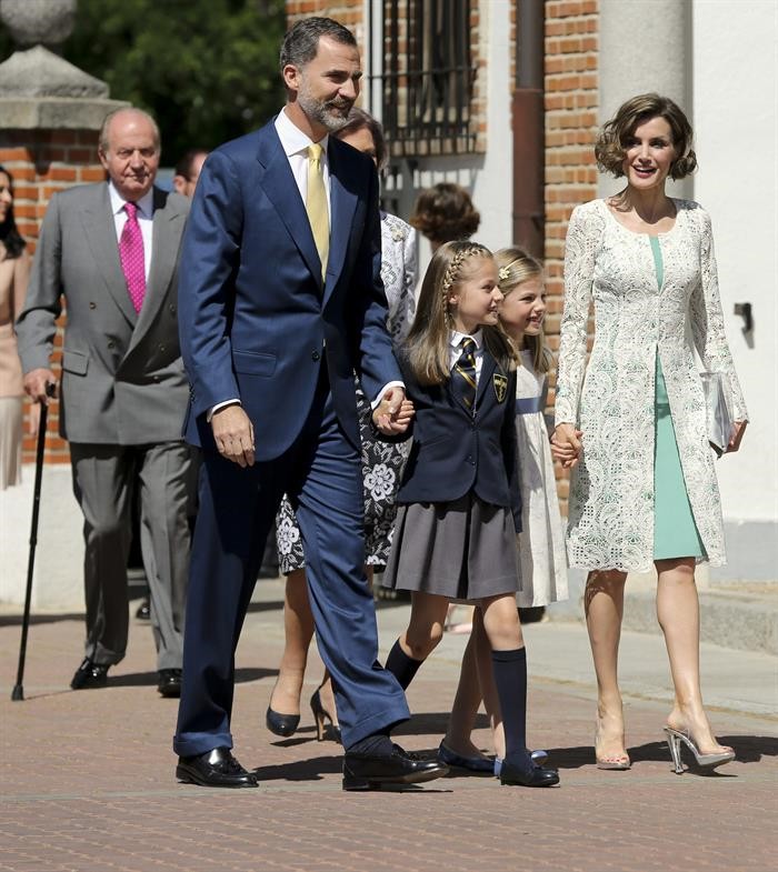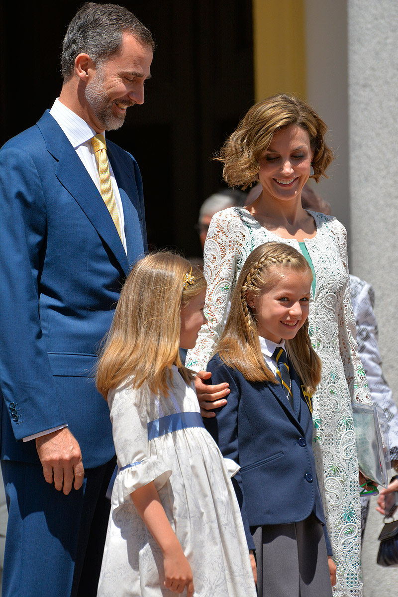 Letizia llevaba un abrigo blanco troquelado y un vestido verde turquesa de Felipe Varela, además de unas bonitas sandalias. Felipe VI optó por elegante un traje con una corbata amarilla. La pequeña Sofía llevaba un vestido blanco con cinturón azul, mientras Leonor, que hacía la comunión, el uniforme del colegio: falda gris con jersey azul