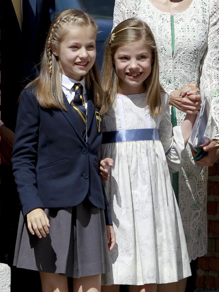 Las dos hermanas. La infanta Sofía llevaba un vestido blanco y la Princesa de Asturias hizo la comunión de uniforme, como el resto de sus compañeros