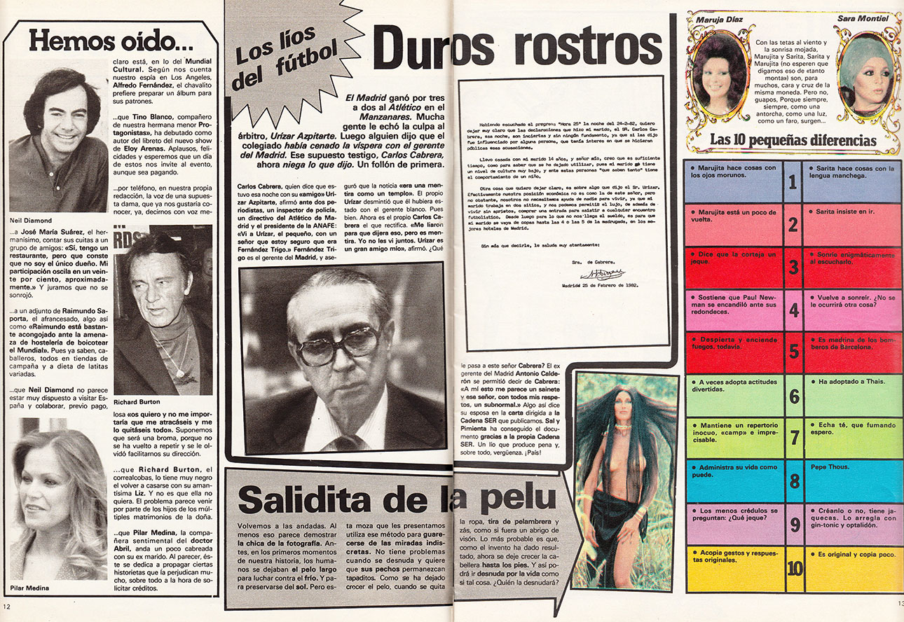 En "Hemos oído" se publicaban rumores, dimes y diretes de personajes como el hermano del entonces presidente de gobierno, de altos cargos de la organización del mundial de fútbol que estaba a punto de tener lugar en España, de damas de la sociedad. Los líos del fútbol no dejaba árbitro ni presidente ni jugador con cabeza. Mientras que en Las 10 pequeñas diferencias se aprovechaba para hacer sangre con los personajes enfrentados, en este caso Sara Montiel y Marujita Díaz