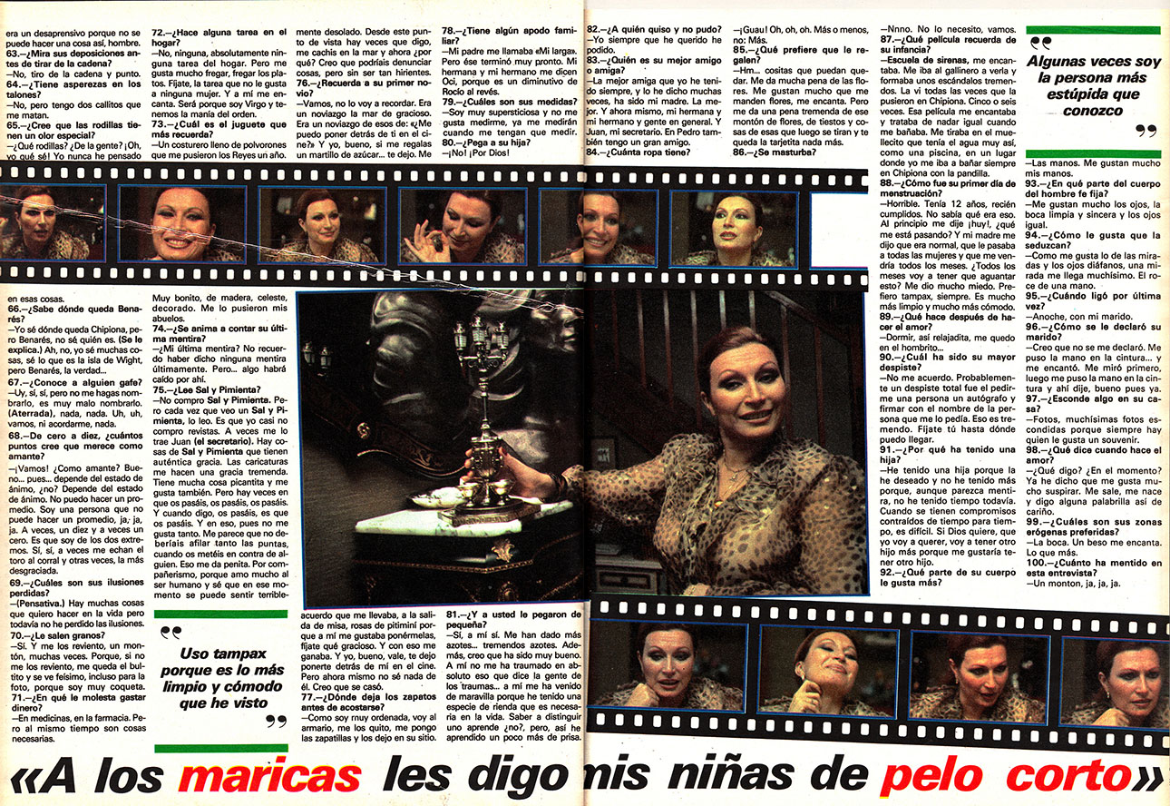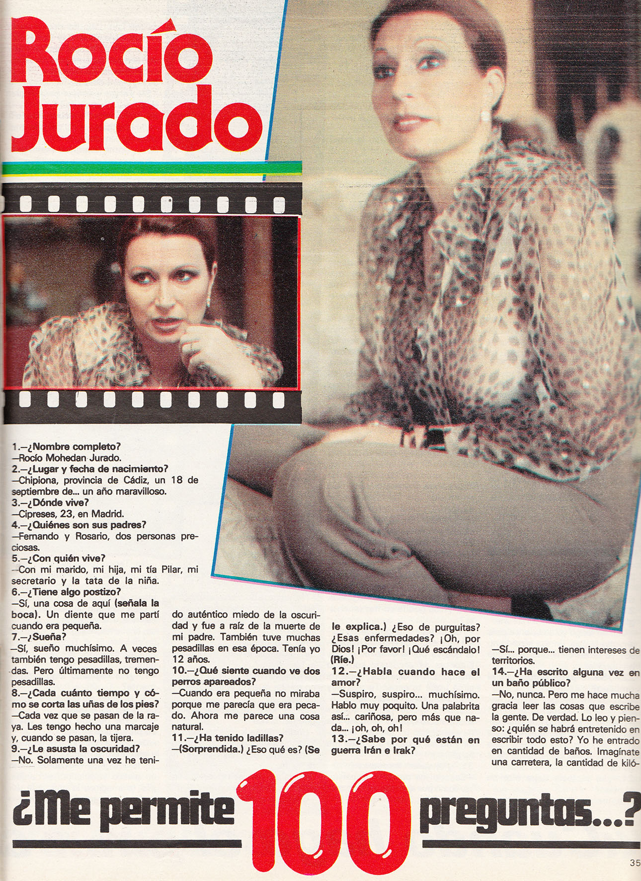 La sección estrella era "¿Me permite 100 preguntas?" Era una extensa entrevista/cuestionario donde siempre se preguntaba lo más incómodo, sexo, drogas, problemas financieros, pullitas. Rocío Jurado se sometió al tercer grado enfundada en camisa con estampado de leopardo o animal print, que dirían las modernas de hoy en día.