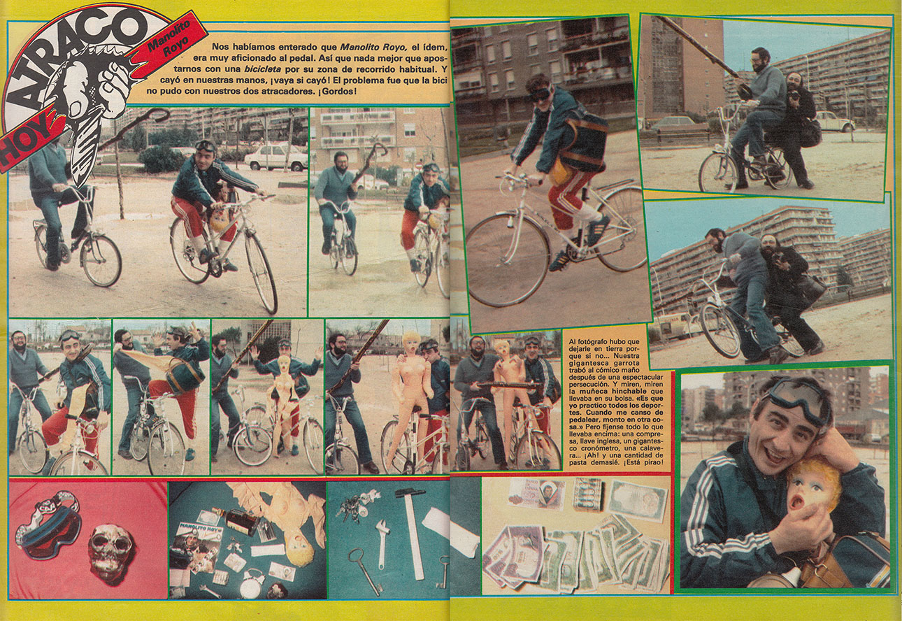 Otra de las secciones estrella fue "Atraco". Consistía en vaciar el bolso o los bolsillos del personaje entrevistado. En esta ocasión le tocó al humorista Manolito Royo. Siempre sospeché que este atraco no lo era tanto, ya que la supuesta víctima sabía perfectamente de lo que se trataba y llevaba a la entrevista lo que le daba la gana mostrar. En el ejemplo de esta semana, una llave inglesa, una muñeca hinchable, una compresa y mucho dinero.