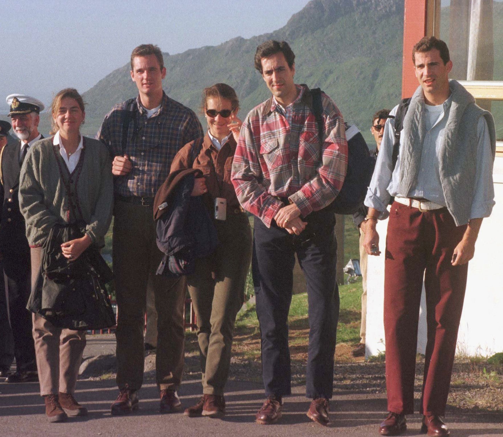 Imagen del año 2000. La infanta Cristina, su prometido Urdangarín, la infanta Elena y Don Jaime de Marichalar con el príncipe Felipe durante la visita al museo Vikingo en la localidada Noruega de Lofoten.