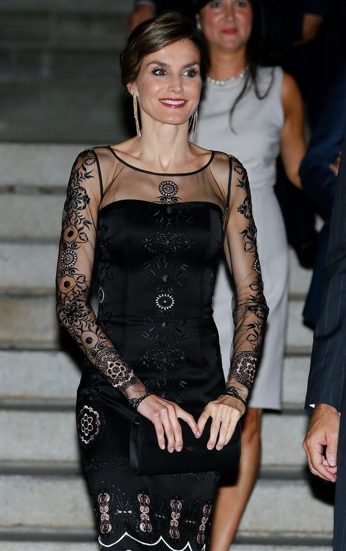 Para la ocasión, la reina Letizia estrenó un vestido de Felipe Varela negro con las mangas y el escote transparente y repleto de pedrería. Además, lució uno de sus recogidos favoritos. El Rey se decantó por un traje azul marino y una corbata lila.
