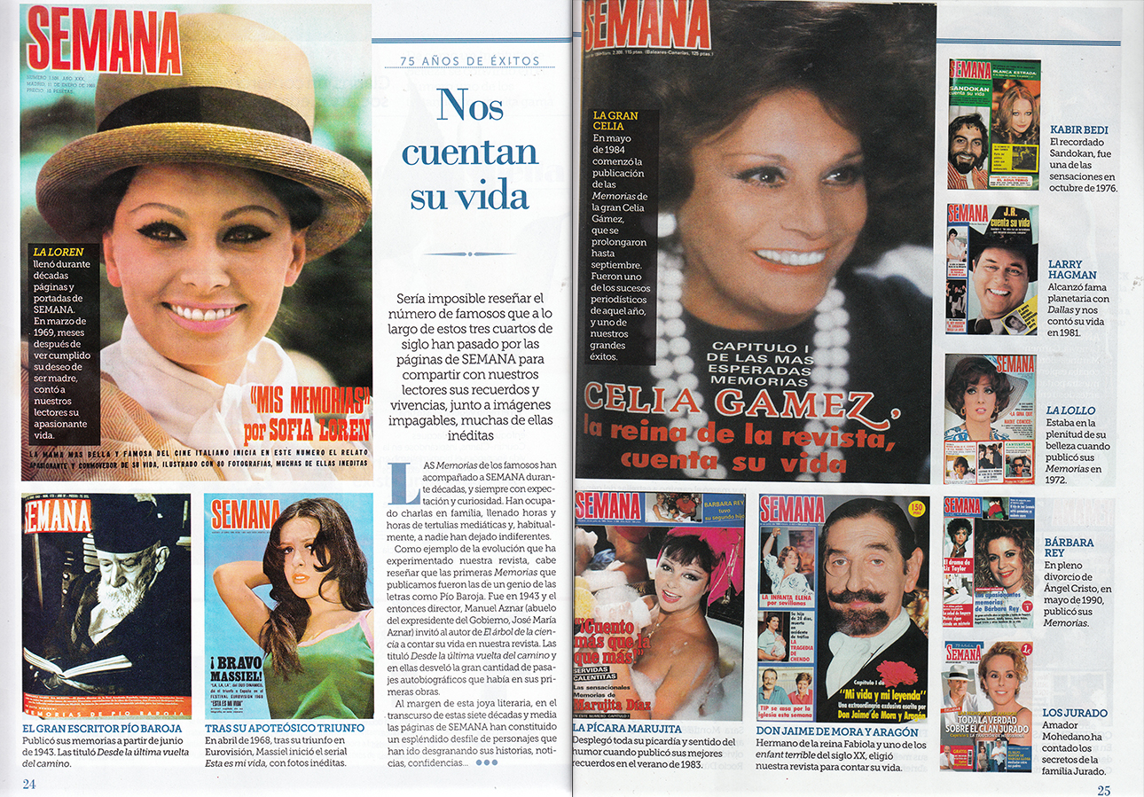 SEMANA nos recuerda que muchos son los famosos que han aprovechado las páginas de la revista para narrar sus memorias. Escritores como Pío Baroja, vedettes como Celia Gámez, cantantes como Massiel, actrices como Gina Lollobrigida o Sofía Loren, figuras patrias de las variedades como Marujita Díaz o Jaime de Mora y Aragón y fenómenos efímeros, como los televisivos Kabir Bedi y Larry Hagman, Sandokán y J.R., fenómenos de masas de su tiempo.