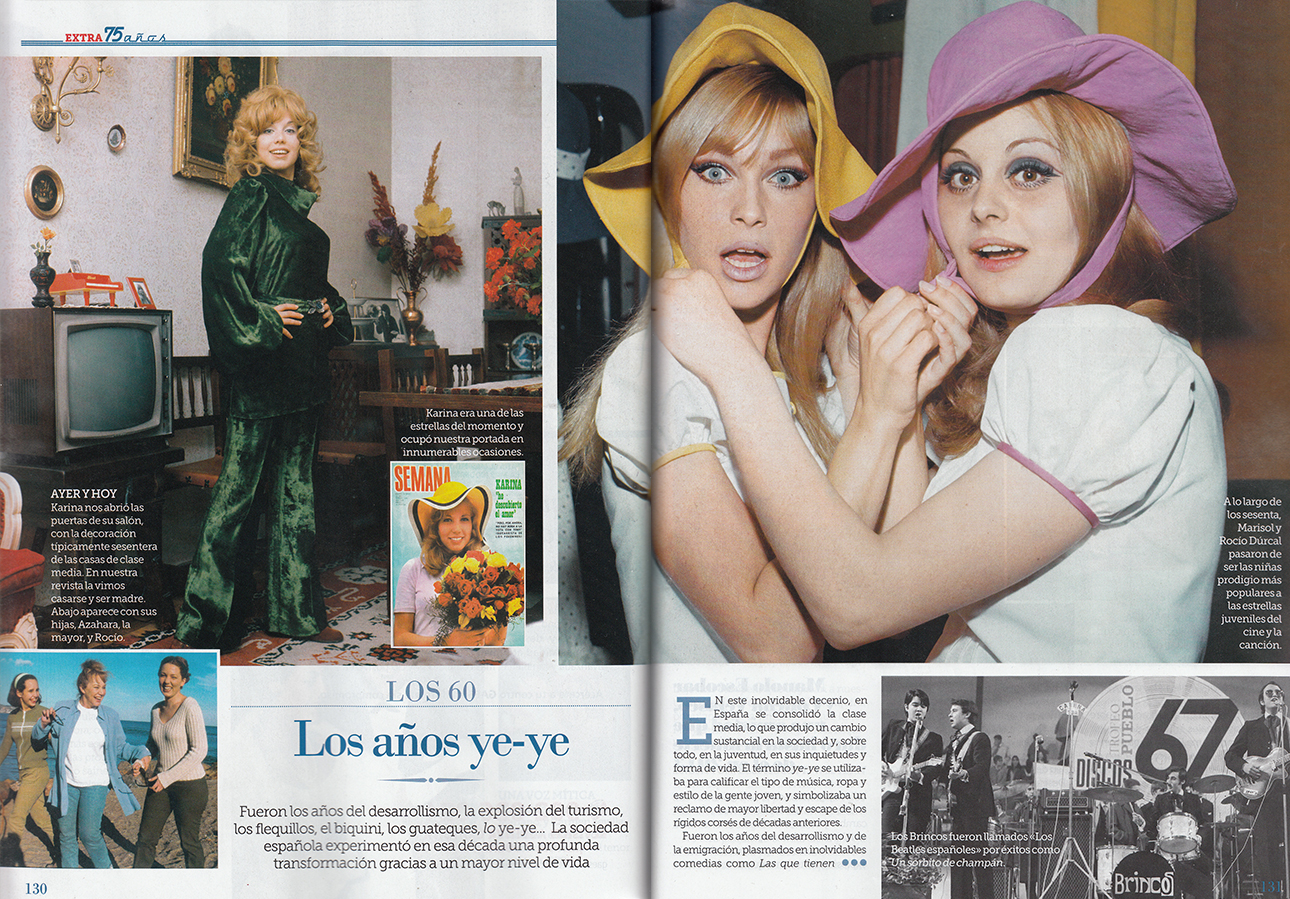 La revista muestra también un repaso década a década, desde la posguerra hasta nuestros días, del blanco y negro al color. Nos recuerda que los años 60 fueron lo de los ye-yés y que en España se hizo una música pop a la altura de los cánones internacionales. Figuras como Karina y unas ya adultas y preciosas Rocío Dúrcal y Marisol reinaban entre las favoritas del gusto popular.