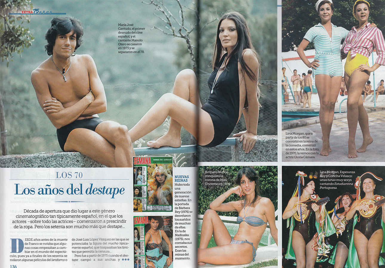 Con los años 70 llegaron esas nuevas estrellas más dispuestas a enseñar carnaza. En todos los sentidos. Los años del destape, como fenómeno nacional digno de estudio antropológico, están injustamente infravalorados. Las revistas se alimentaron de Nadiuska, de Bárbara Rey, de nuestra única Miss Universo, Amparo Muñoz. Y la pareja de guapos de moda la formaban Manolo Otero y María José Cantudo, primer desnudo integral del cine español.