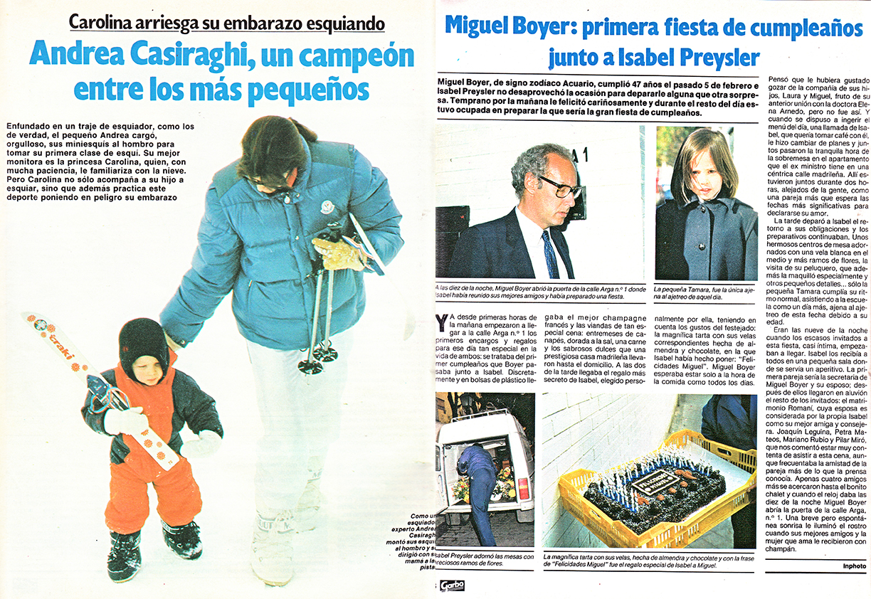 Los mismos personajes que hoy llenan las páginas de las revistas de corazón lo hacían ya hace treinta años. Carolina de Mónaco e Isabel Preysler, dos reinas indiscutibles de la crónica rosa. Carolina, embarazada de Carlota. Isabel Preysler, en una situación vital muy parecida a la actual, celebrando el cumpleaños de su nuevo amor cuando ya no era imposible ocultarlo a la prensa.
