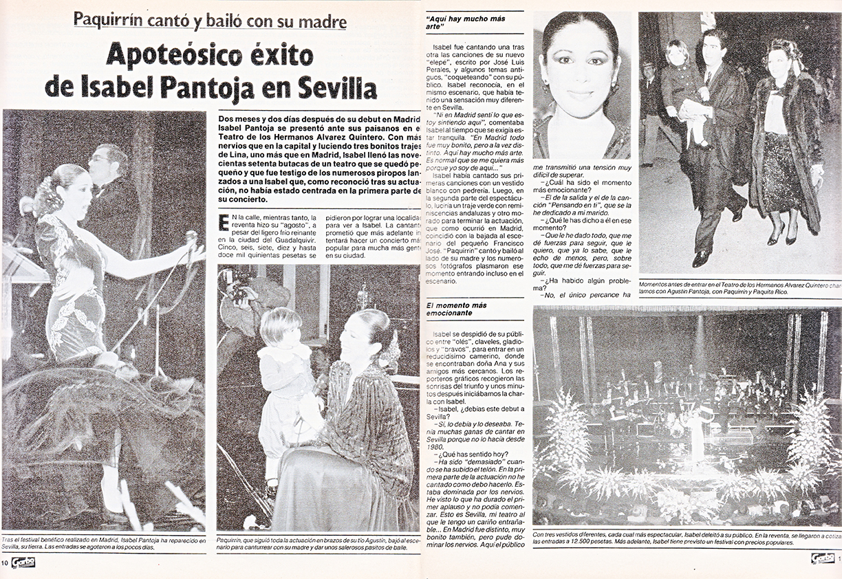 Apenas un par de meses antes Isabel había actuado en el Teatro Real y continuaba su gira triunfal. En ese momento todos los titulares la encumbraban como "la viuda de España". Presentaba sobre los escanrios Marinero de Luces, el disco que marcó su vuelta tras la muerte de Paquirri. Vida y carrera siempre unidas.