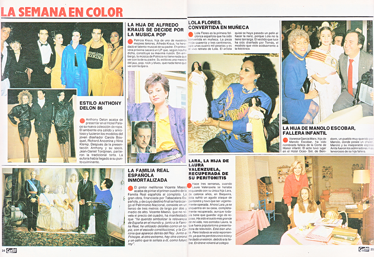 Siempre es interesante revisar las noticias de épocas pasadas. Las fotos que muestran la peor moda ochentera en todo su esplendor. El recuerdo de que hubo otros retratos de la Familia Real antes del de Antonio López. Ver que Lara Dibildos y Vanessa la hija de Manolo Escobar vivían con naturalidad el hecho de ser hijas de famosos. O rememorar que la tristemente desaparecida empresa de muñecas de Marín dedicó una edición especial de sus gitanas a Lola Flores.