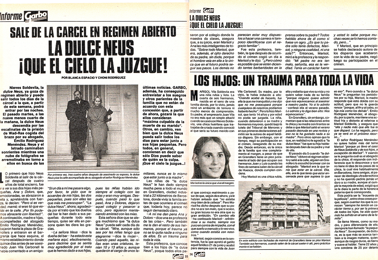 Garbo encabezaba este reportaje con título de película clásica de Hollywood. Y es que el caso de la Dulce Neus llenó las páginas de la crónica negra española durante años. Como la estrella mediática que era, abandonaba la cárcel de su no menos mediático abogado, Emilio Rodríguez Menéndez.