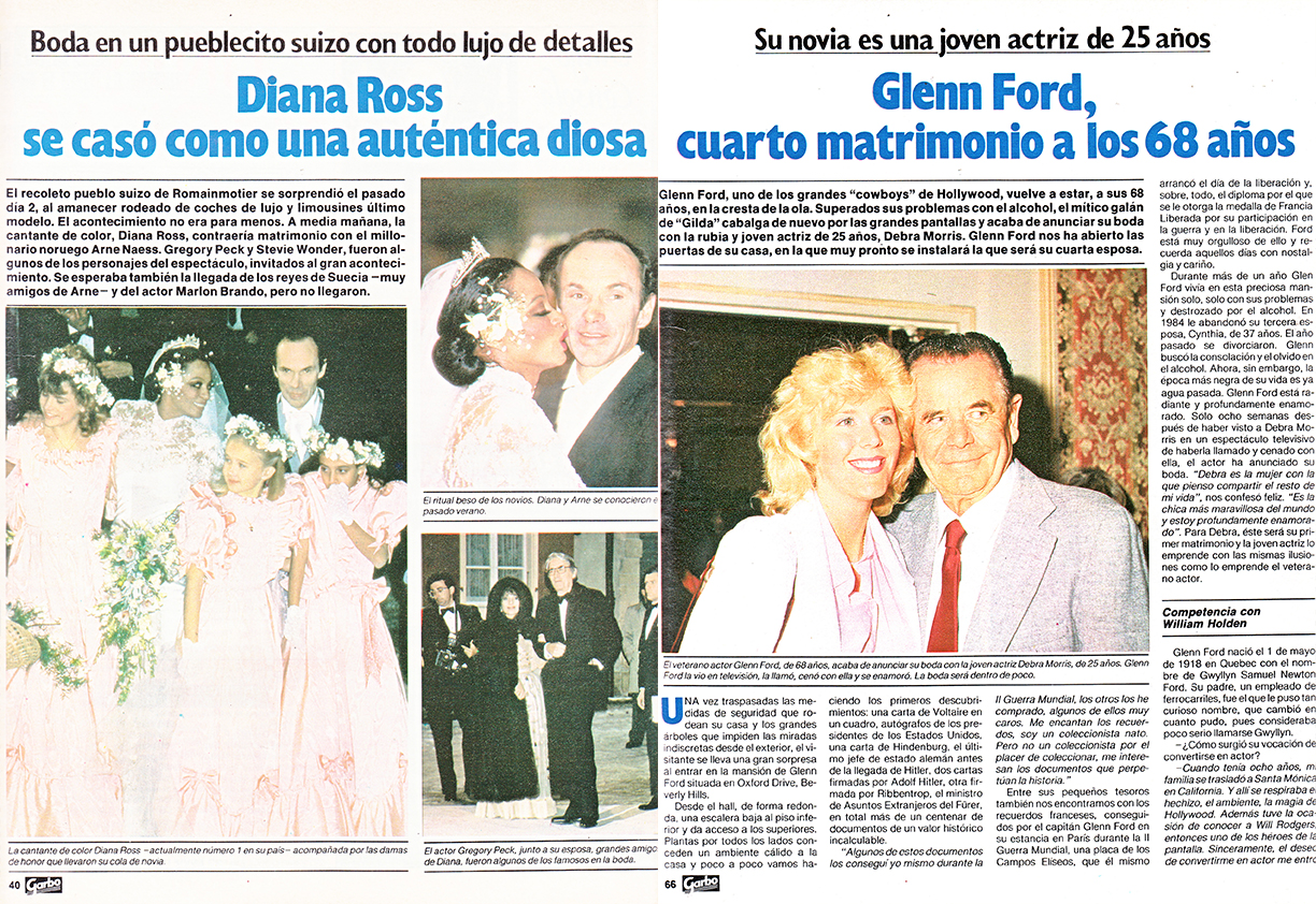 Garbo daba cuenta de algunas noticias internacionales a todo color. Como los matrimonios de las estrellas de la canción o el celuloide. La cantante Diana Ross se casaba a todo lujo en Suiza con el millonario sueco Arne Naess. Y el actor Glenn Ford anunciaba su cuarto matrimonio a los 68 años. Esa relación no llegó a cuajar y aún tendría que esperar hasta 1993 para celebrar esa cuarta boda.