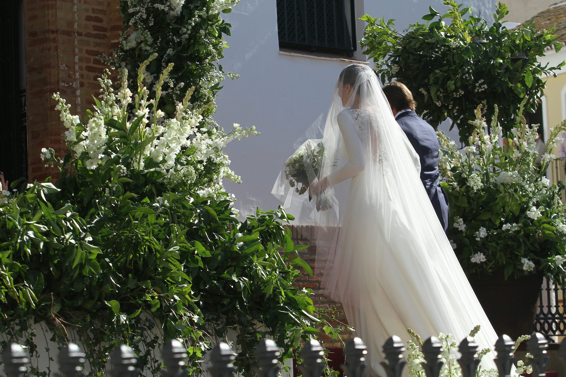 La novia entrando a la parroquia. Se le puede ver la espalda bordada en nudos franceses.