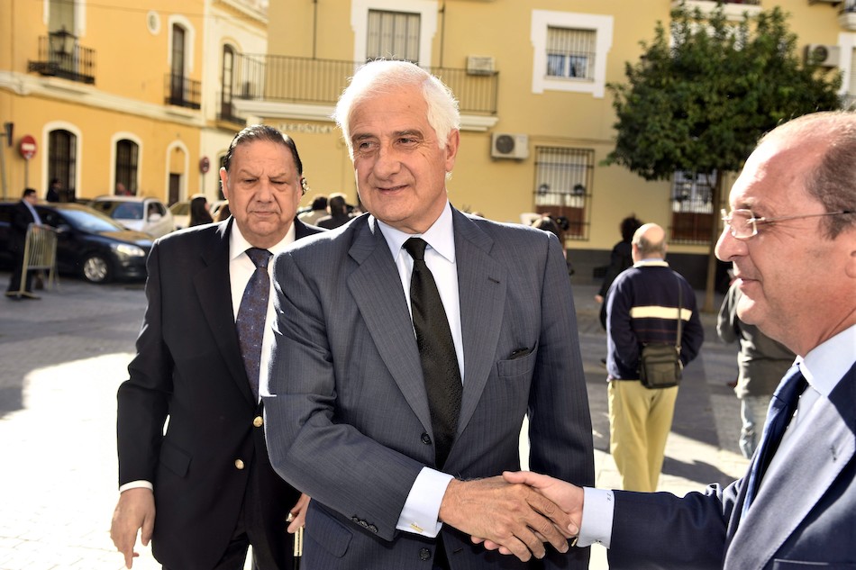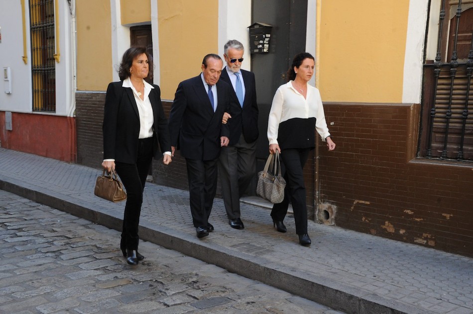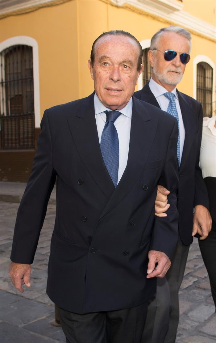 El torero Curro Romero (i), y el que fue médico de la duquesa de Alba, Francisco Trujillo, llegan a la iglesia del Cristo de los Gitanos de Sevilla. Por mediación de Alfonso, los amigos de Cayetana finalmente estuvieron en el evento.