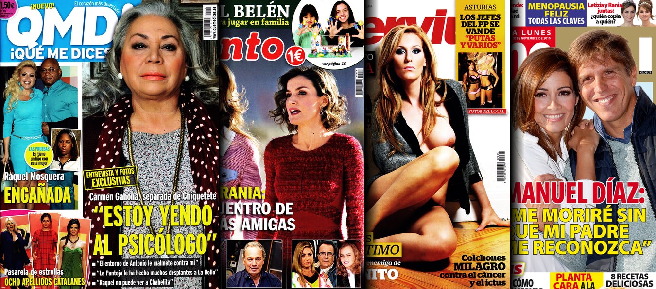 Portadas de las revistas QMD, Pronto, Interviú y Dime.