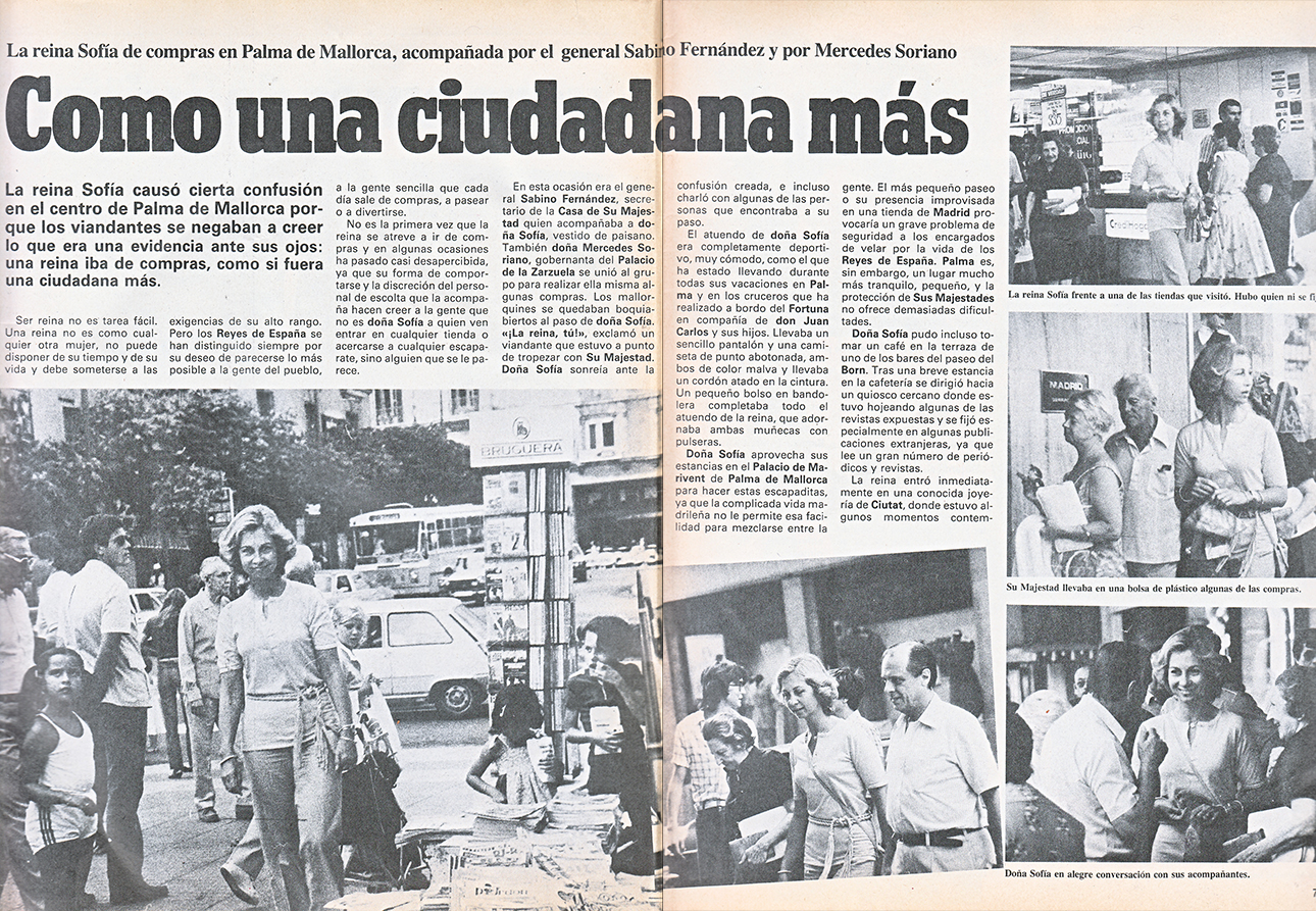 La reina Sofía paseaba y se iba de tiendas por el centro de Palma de Mallorca durante su período vacacional. La acompañaba Sabino Fernández Campo, entonces secretario general de la Casa del Rey, más tarde jefe de la misma. Una imagen que intentaba reforzar la imagen de la institución, recordemos que apenas seis meses antes habían transcurrido los hechos del 23-F.