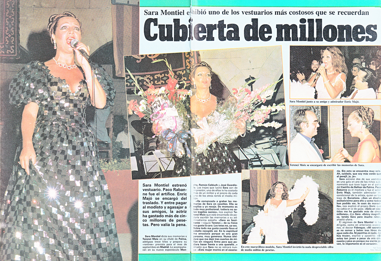 Tras adelgazar trece kilos ("no como y sólo bebo agua"), Sara Montiel presentaba nuevo vestuario de conciertos diseñado por Paco Rabanne en una gala benéfica en Mallorca, donde al igual que la reina, pasaba siempre sus vacaciones. Y en el reportaje descubrimos que estaba dictando sus memorias a Terenci Moix.