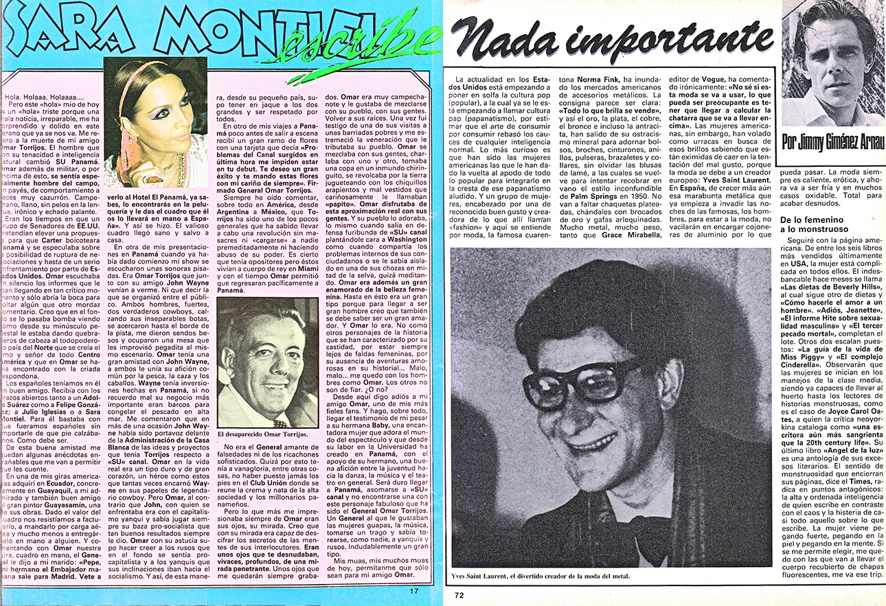 Como cualquier publicación, la revista Protagonistas contaba con colaboradores populares. Uno de ellos, la mismísima Sara, que se mete en política internacional recordando al panameño Omar Torrijos, mencionando al presidente norteamericano Carter y los mezcla con John Wayne como sólo ella puede hacer. Otra de las firmas "con nombre", Jimmy Jiménez Arnau, criticaba la última colección de Yves Saint Laurent y la lista de los libros más vendidos en los Estados Unidos, con títulos como La dieta de Beverly Hills o Cómo hacer el amor a un hombre.