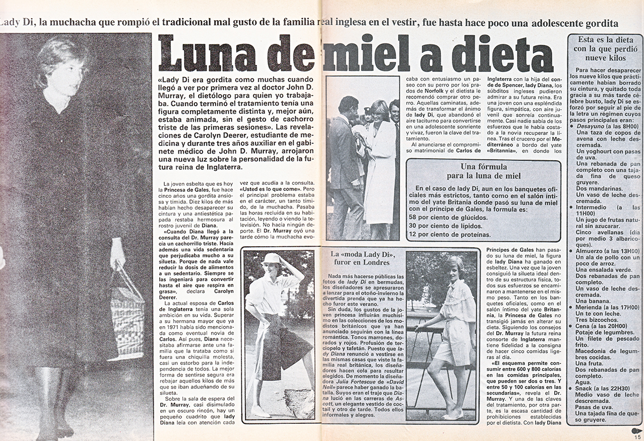 Entre las páginas de Protagonistas no sólo encontramos las dietas de Sara Montiel o la de Beverly Hills. También nos cuentan cómo es el régimen que la recién casada princesa Diana cumple a rajatabla, incluso durante la luna de miel que estaba disfrutando en ese momento. Cinco comidas al día, nutrientes equilibrados y ejercicio físico.