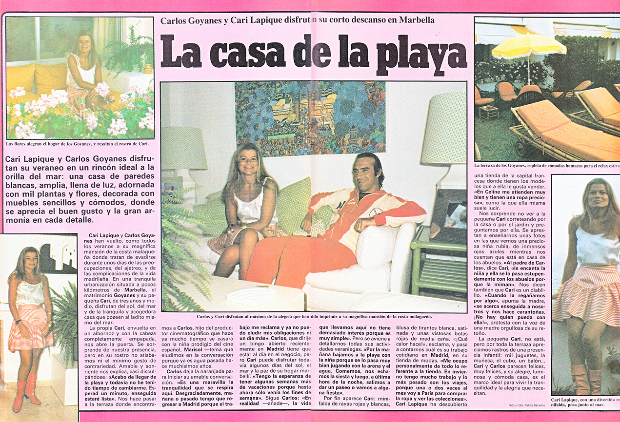 Una de las mujeres imprescindibles en la crónica rosa de ahora y de entonces, Cari Lapique. Posaba en su casa marbellí junto a su marido Carlos Goyanes. Posado no muy distinto a los que podemos ver hoy en día con sus hijas y nietos. Cari aparece modernísima, con botas rojas perfectamente coordinadas (y en el mes de agosto).