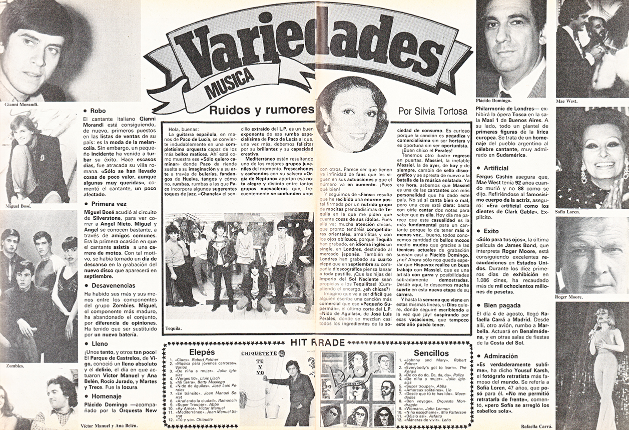 La sección Variedades era la página musical de la revista y estaba conducida por Silvia Tortosa, presentadora entonces de Aplauso, el programa de música de Televisión Española. Novedades discográficas, conciertos… Miguel Bosé, Tequila, Los Zombis, Plácido Domingo, Chiquetete, Víctor y Ana, Paco de Lucía, Raffaella Carrá… un cóctel ecléctico.