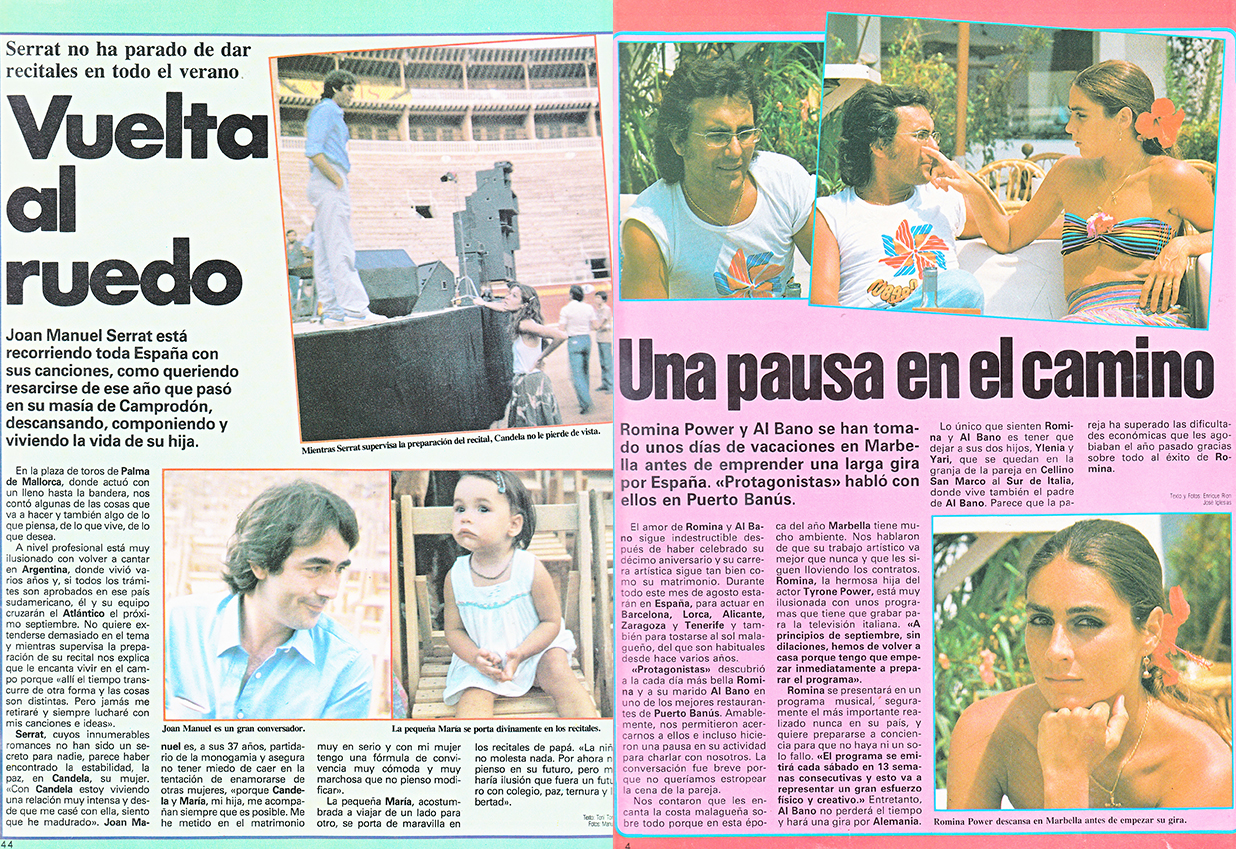 Por un lado, las galas de verano, esos conciertos que mantenían a los artistas ocupados durante toda la estación y a cualquier pueblo de España surtido de espectáculos. Joan Manuel Serrat aparece probando sonido ante la mirada de su hija y su mujer Candela, unión que ya dura casi cuarenta años. También de gira, Romina y Al Bano se tomaban un respiro en Marbella.