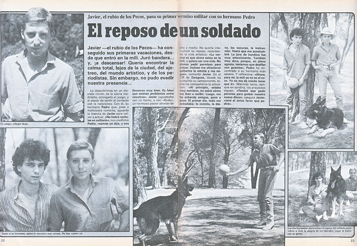 Mientras cientos de cantantes recorrían España con sus conciertos, los Pecos se veían obligados a parar en lo más alto de la fama. Javier, el rubio, estaba en la mili. Los jóvenes de hoy no se pueden ni imaginar el trastorno que suponía el servicio militar, apartando a los jóvenes durante casi dos años de sus aficiones y profesiones.