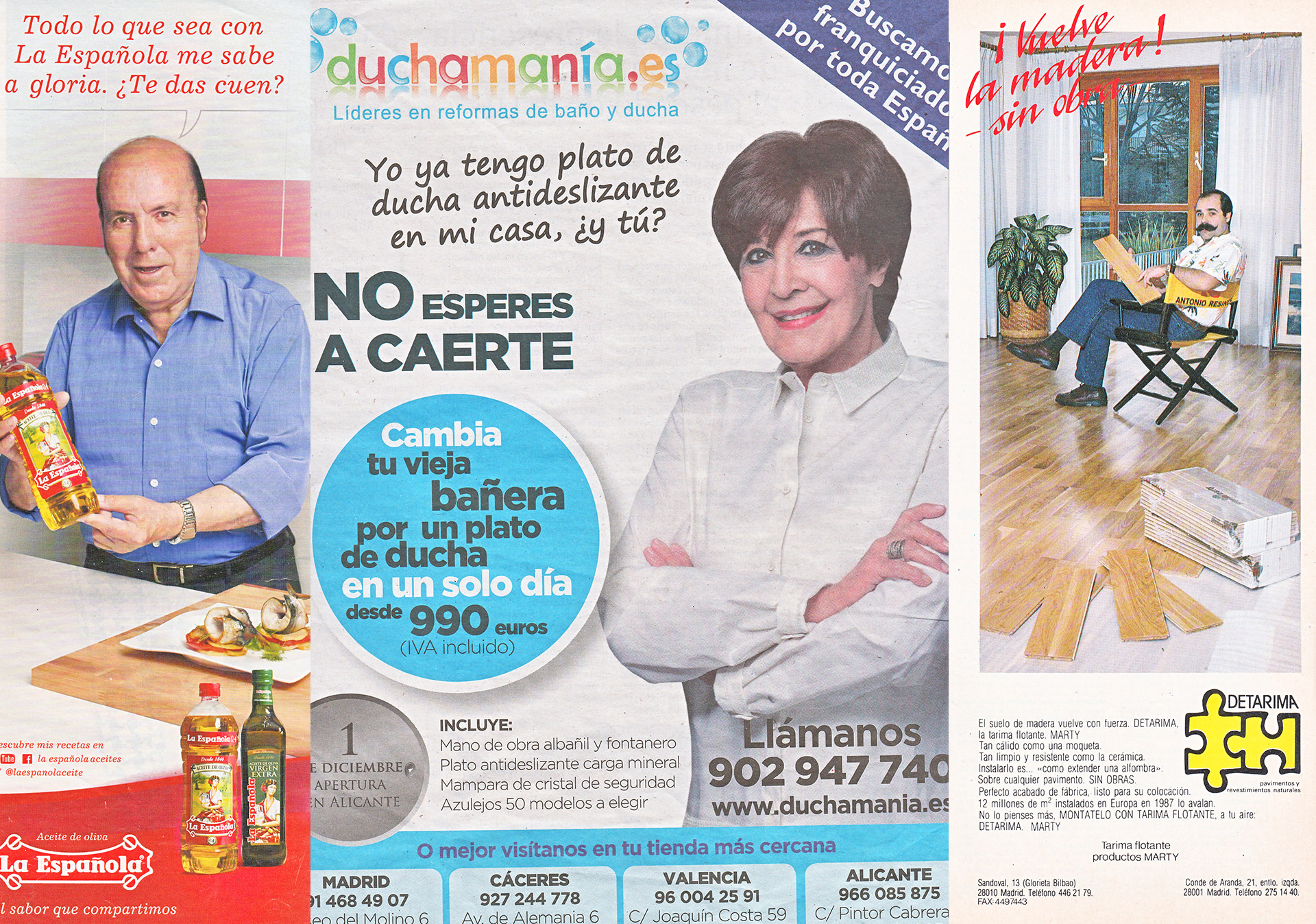 Da igual que sea vender aceite, mamparas de ducha o tarimas flotante. Lo importante es contar con personajes que caigan bien al público. Y Chiquito de la Calzada, Concha Velasco (con muchísimas campañas a su espalda) y Antonio Resines son un valor seguro.