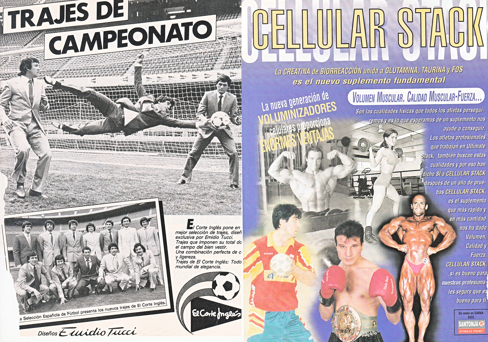 Ya sea en anuncios del sector, como el de suplementos deportivos donde aparece el campeón de boxeo Javier Castillejo, o como modelos de trajes, como este anuncio de la Selección Española de Fútbol de hace algunas décadas, los deportistas tienen un segundo sueldo gracias a sus ingresos publicitarios.