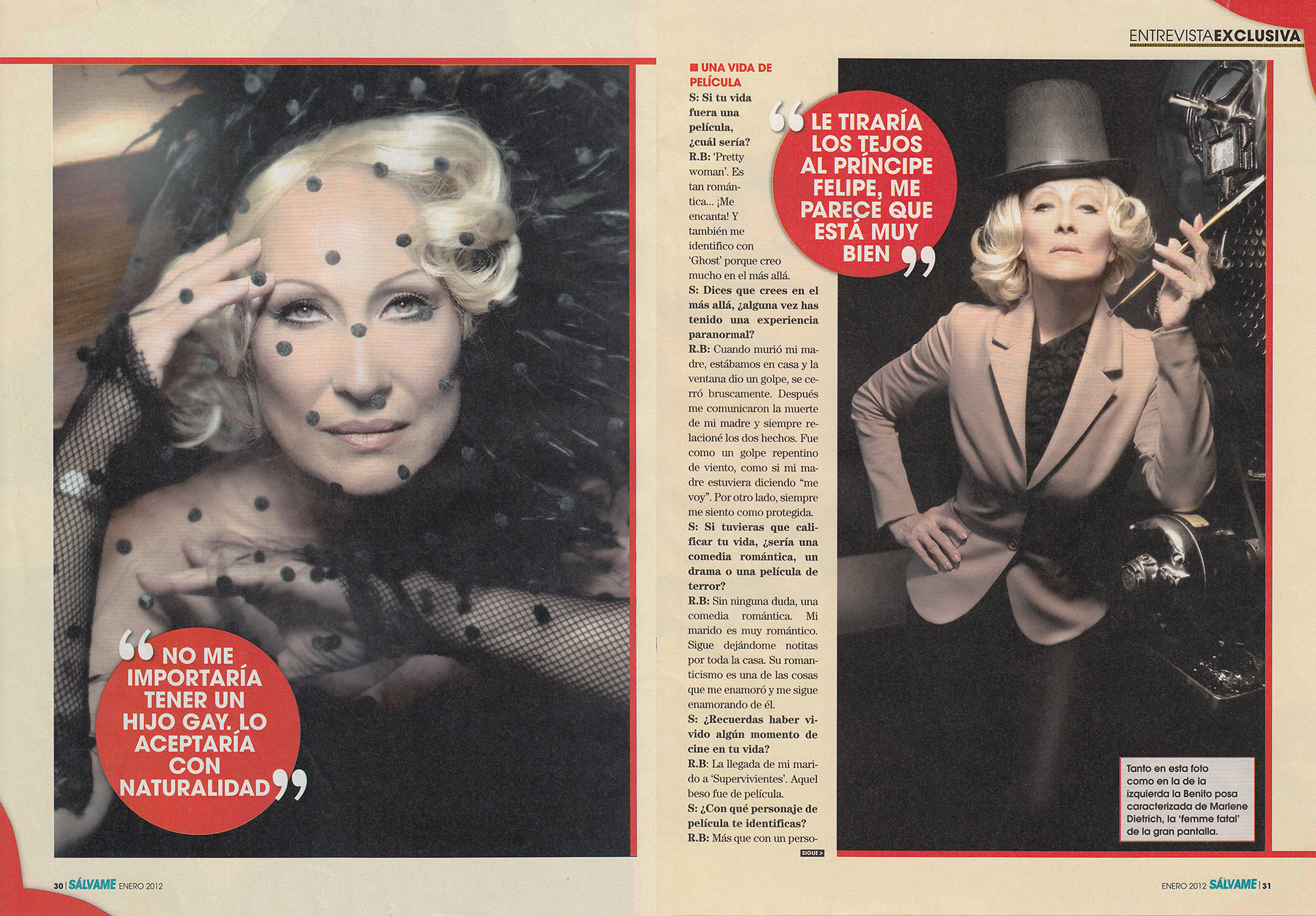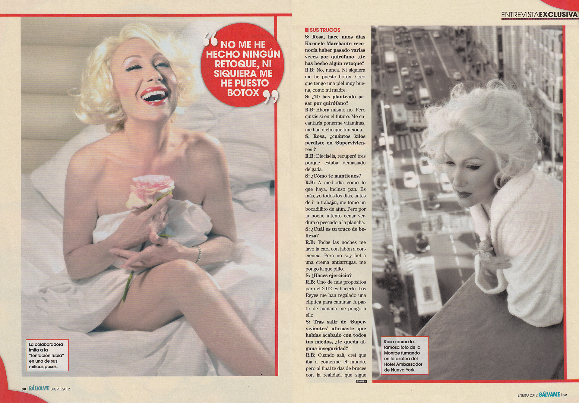 Así resume la entrevistadora la carrera mediática de Rosa Benito, caracterizada en esta doble página como Marilyn Monroe.