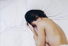 Aparece tapándose el pecho con su brazo y con las sábanas la parte inferior.