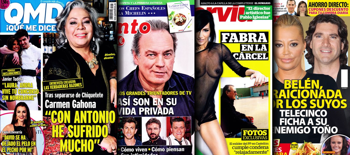 Portadas de las revistas QMD, Pronto, Interviú y Dime.