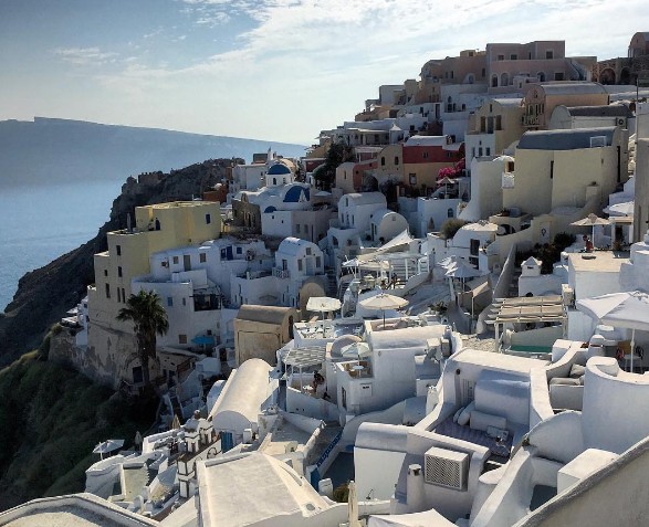 La mujer del año de la revista Esquire (año 2013) es consciente de que causa sensación por sus espectaculares curvas. Esta otra imagen ante las paredes encaladas de Santorini lo demuestra.
