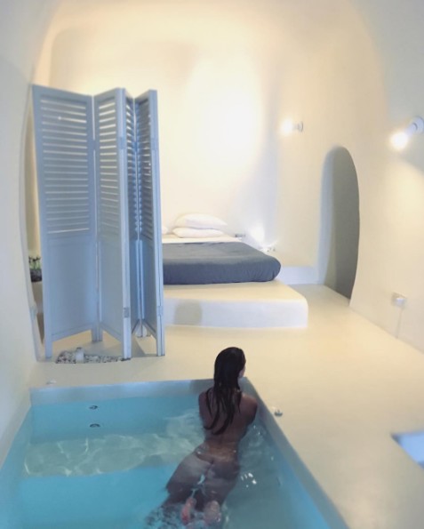 Por supuesto, la cifra de "likes" de la imagen anterior, o de esta que nos ocupa, aumentan por segundo. Ahí tienen a Emily tomando un refrescante baño frente a su cama, en la habitación que tiene en Santorini.