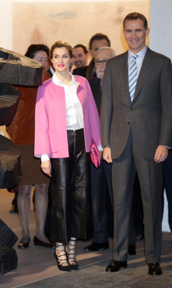 Para la inauguración de la 35ª edición Feria Internacional de Arte Contemporáneo (ARCO), Doña Letizia acaparó todas las miradas con un llamativo abrigo color rosa confeccionado en lana que ha lucido en varias ocasiones. Aunque lo que más comentarios despertó fueron los pantralones capri en cuero negro y cremallera delantera. Todo combinado con una camisa blanca que aportaba el toque elegante y acompañado con bolso de mano rosa a juego con la chaqueta y sandalias negras de tiras. Un calzado curioso a prueba del frío madrileño.