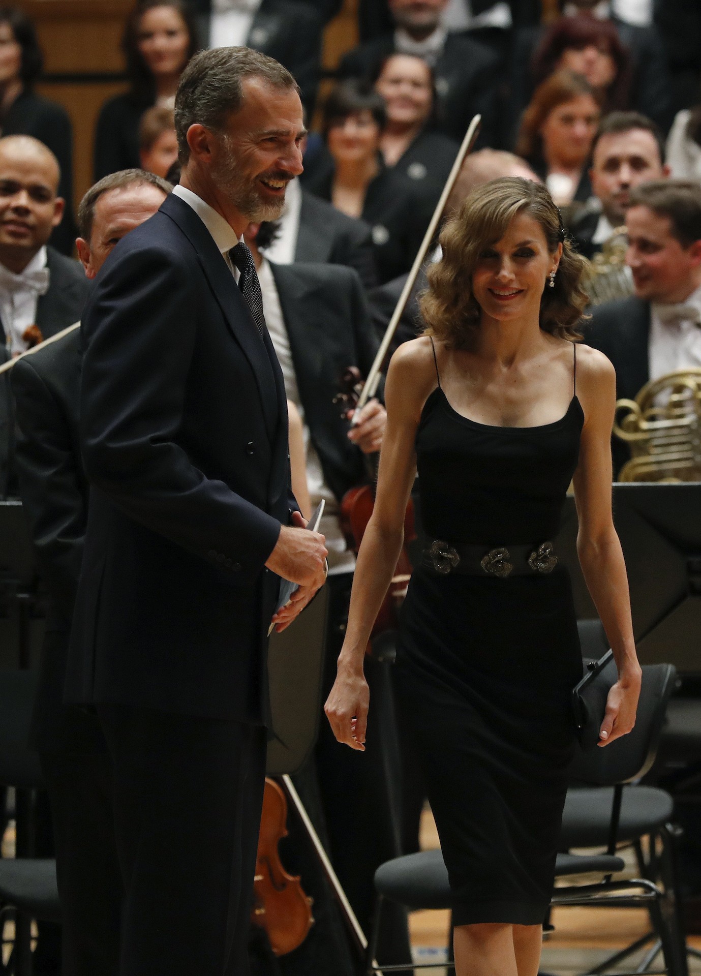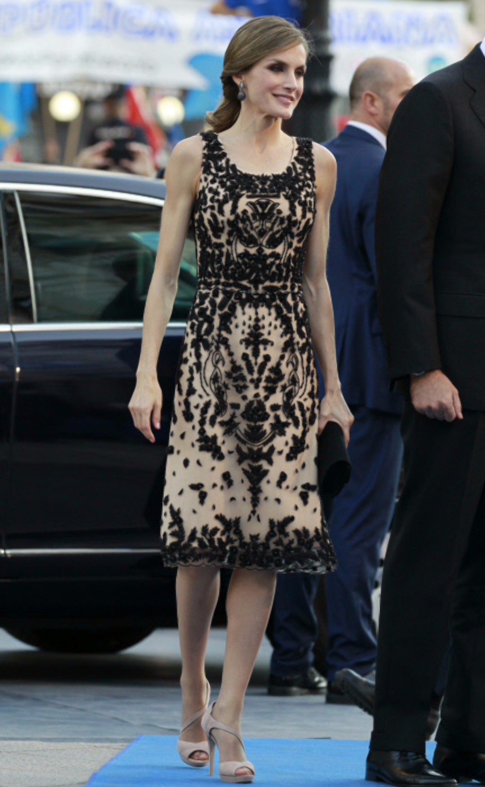 En el primer día de actos institucionales con motivo de la entrega de los Premios Princesa de Asturias, Doña Letizia escogió un vestido de estilo lencero, negro y ajustado que combinó con un cinturón de flores. Llamaban la atención los tirantes, muy finos y que permitían apreciar la musculación de la reina, gran aficionada al deporte. Completaban el look unos tacones y un peinado estilo años 50, con ondas y recogido a un lado con un broche con forma de mariposa. El conjunto realzaba la belleza de la reina, pero mucho se habló sobre si era adecuado para el acto.