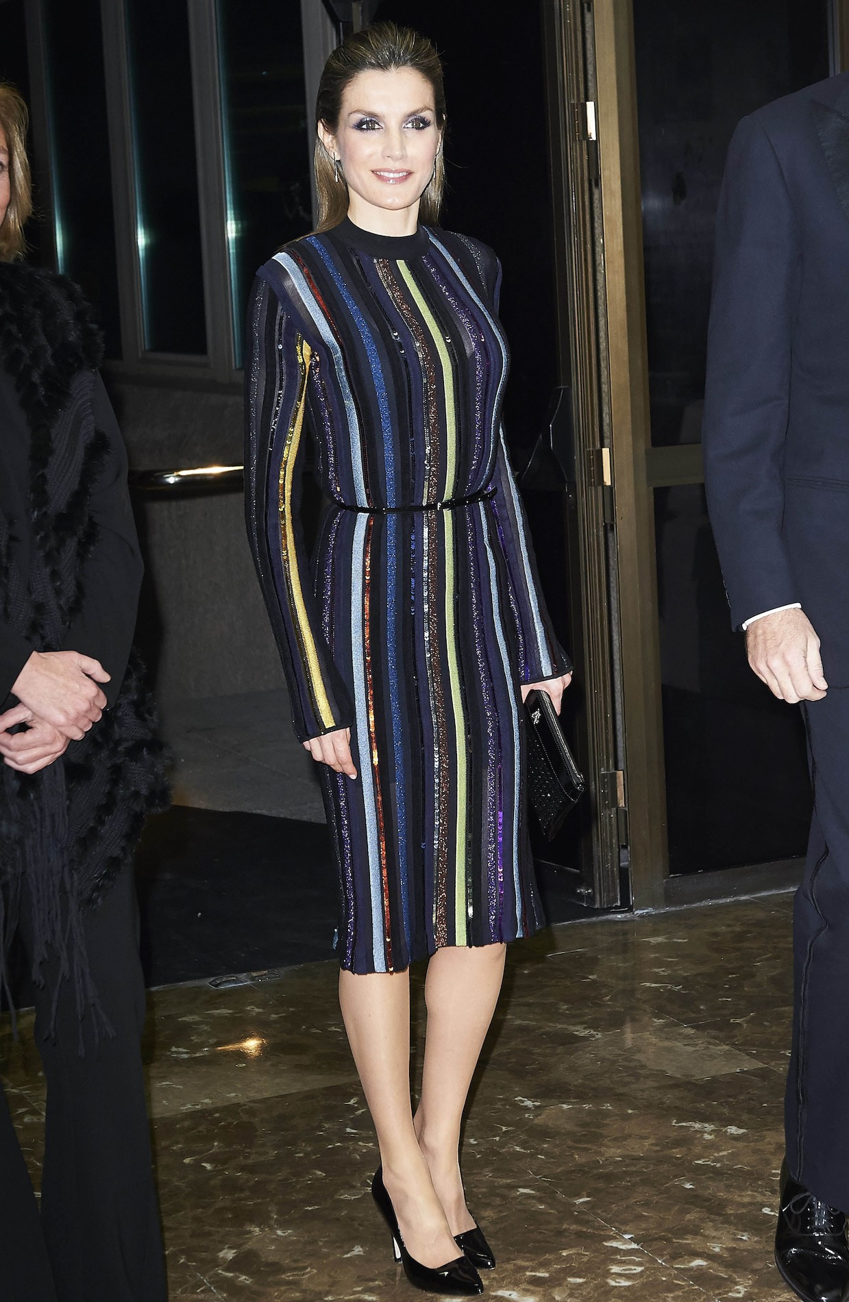 El último bombazo -aunque acierto- de Doña Letizia fue durante la entrega de premios de periodismo Mariano de Cavia, Luca de Tena y Mingote. La reina llevó un vestido por debajo de la rodilla en tonos multicolores con detalles metálicos y lentejuelas de Nina Ricci que cuesta 2.500 euros y lo acompañó con un discreto cinturón negro de cuero que estilizaba su figura y stilettos negros. Lo mejor de todo, el wet look, es decir, pelo ligeramente engominado con efecto mojado, hacia atrás y sin raya.