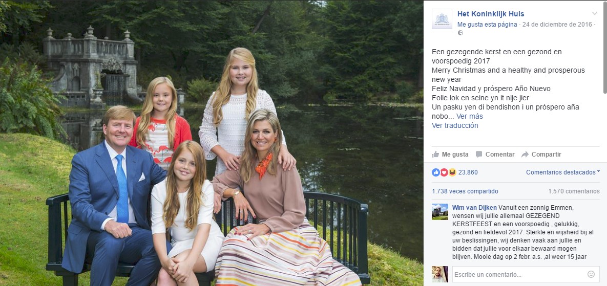 Felicitación navideña a través de la redes sociales donde encontramos al rey holandés junto a su esposa y sus hijas Catalina Amalia, Alejandra y Ariadna.