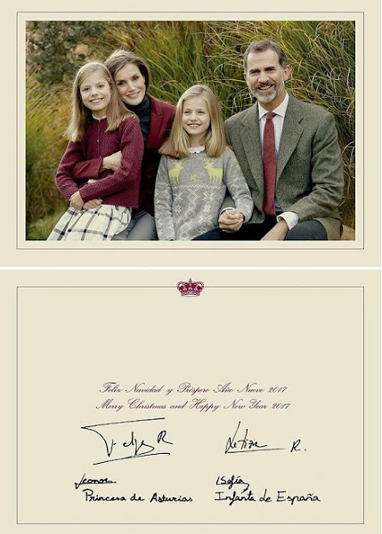 La Casa del Rey publicaba su tradicional felicitación de las fiestas navideñas en su página web oficial. Don Felipe y Doña Letizia posan con sus hijas Leonor y Sofía muy sonrientes en el Palacio de la Zarzuela y acompañan la imagen con un texto impreso en español y en inglés en el que se puede leer "Feliz Navidad y Próspero Año Nuevo 2017".