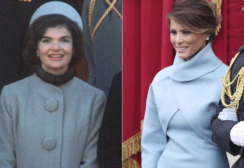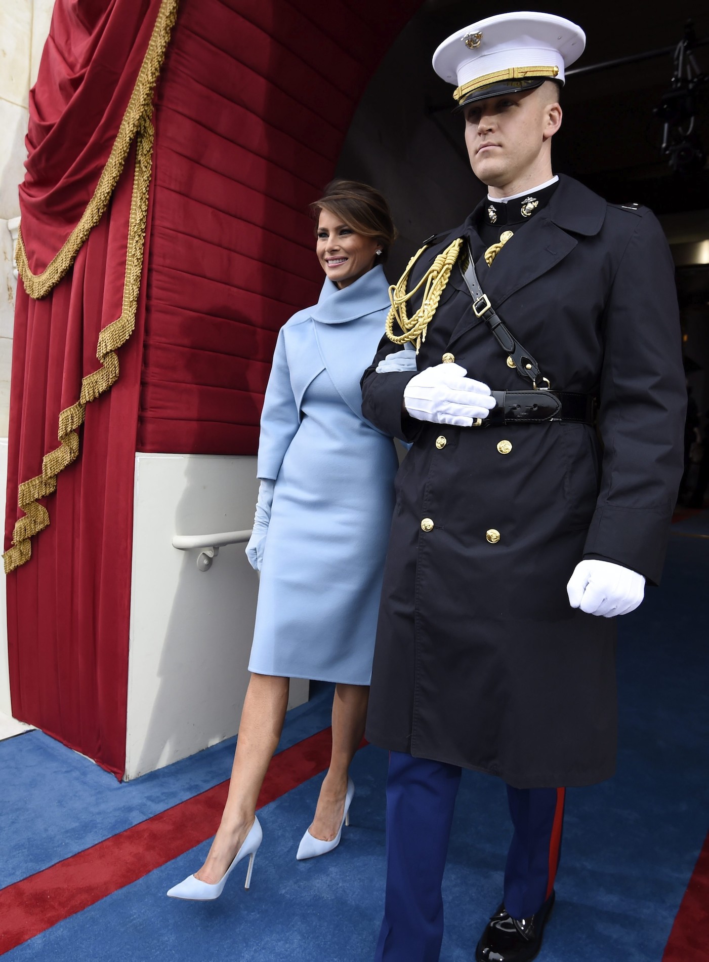 Para un día tan señalado, el vestuario debía ser muy especial. Aunque Melania tiene especial predilección por los diseñadores europeos, se esperaba que se decantara por uno americano, y los rumores que apuntaban a que el elegido sería Ralph Lauren, se han confirmado. La primera dama lució un vestido de color azul, largo por debajo de la rodilla y hecho a medida por la casa norteamericana. Al vestido le acompañaron guantes y zapatos en la misma tonalidad y una chaqueta cruzada con cuello en chimenea. Muy sobria y discreta pero a la vez elegante, completó el look con recogido en moño y flequillo lateral.