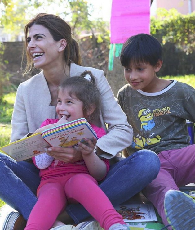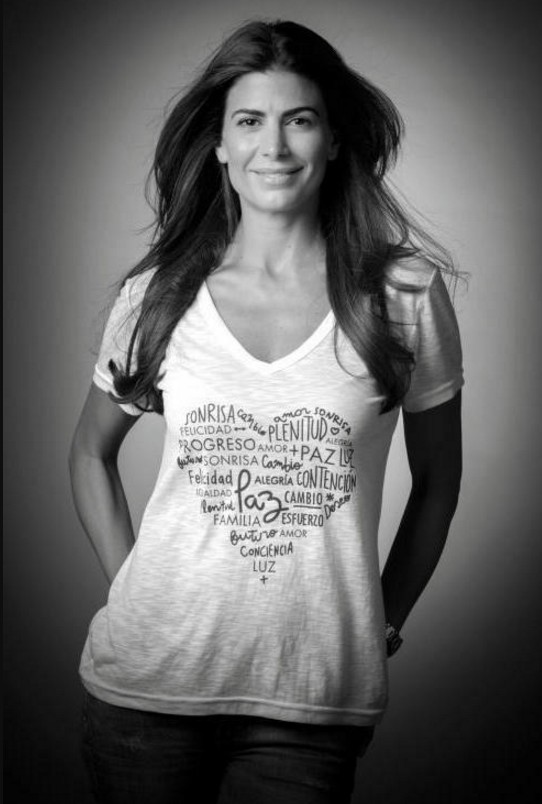 Juliana Awada posa con una camiseta solidaria en beneficio de la Fundación CONIN en Argentina.