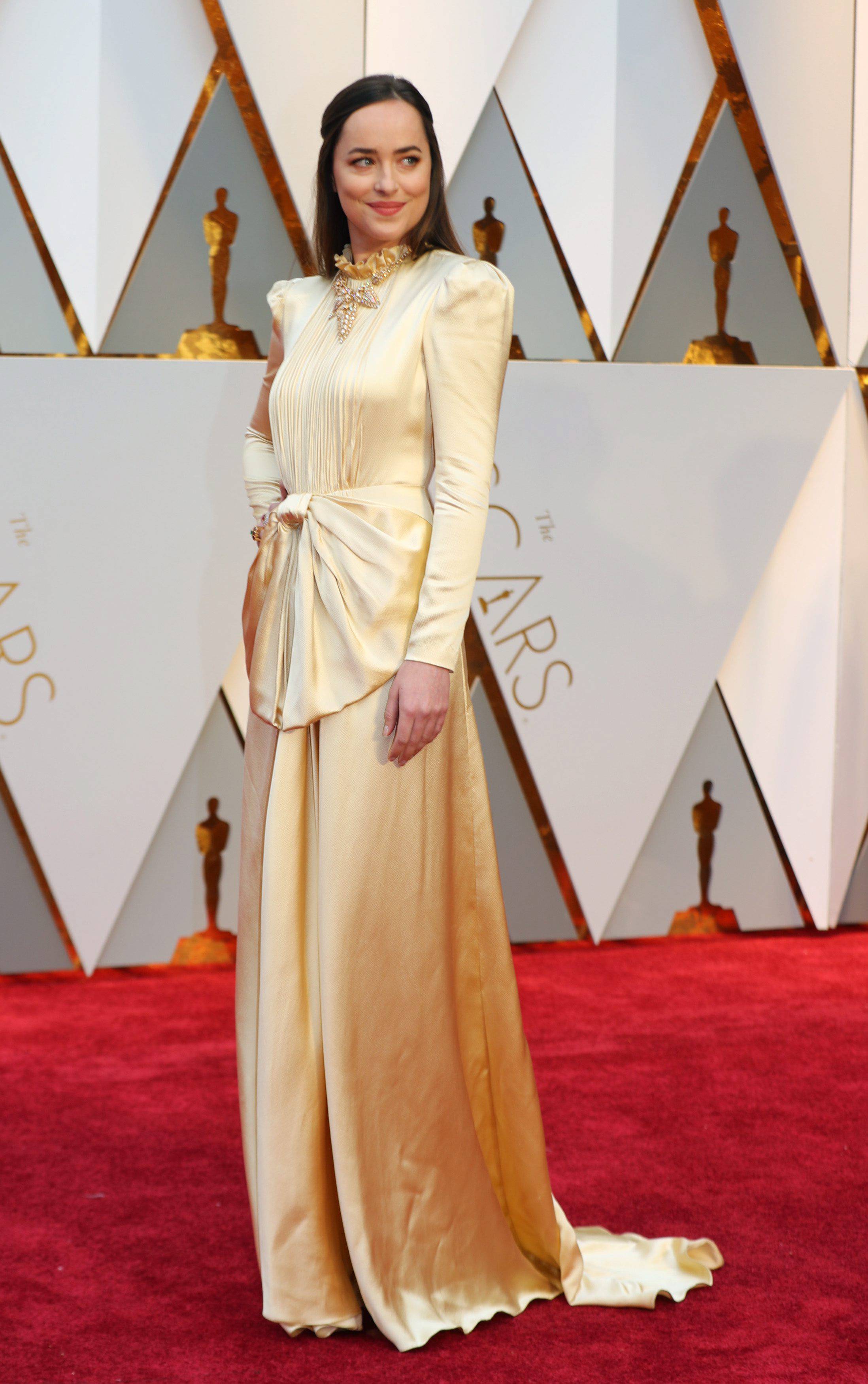Nada está bien en este estilismo de Dakota, desde el peinado hasta el diseño dorado sin gracia.