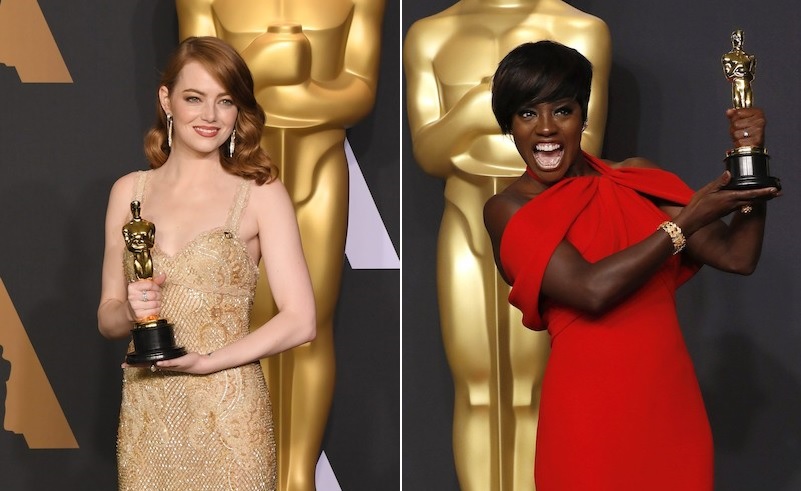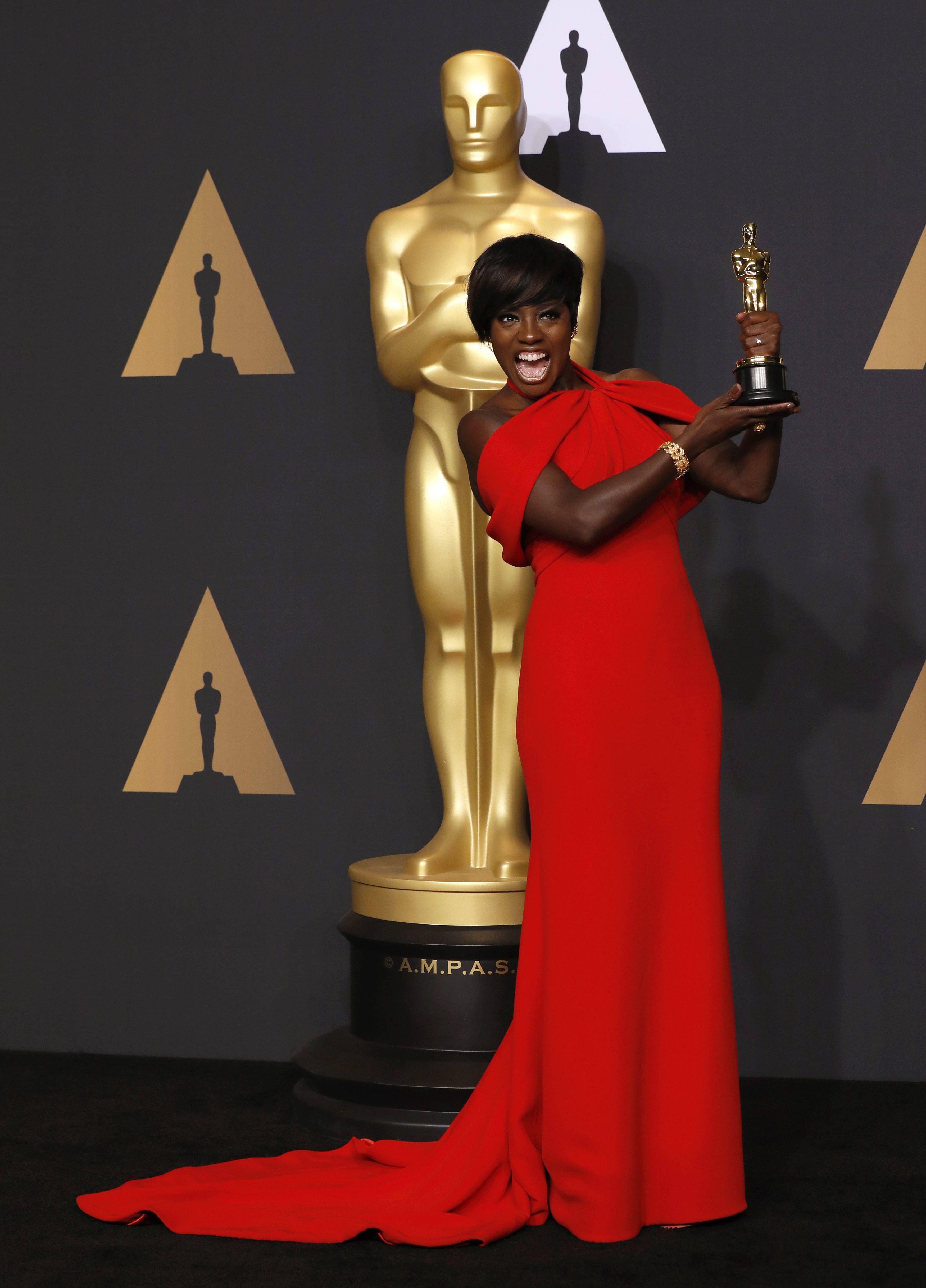 Triunfante y elegante, Viola Davis con su Oscar y su diseño en rojo de Armani Privé.